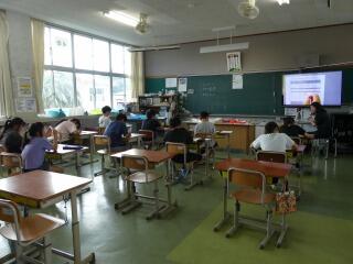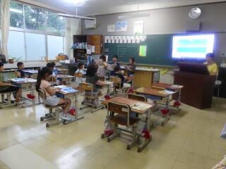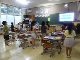 夏休みに夜更かしをし朝いつまでも寝ていると、夏休みが終わってからも、体がだるく感じ気持ちよく起きることが難しくなります。そこで、養護教諭の先生が、睡眠について呼びかけをしてくれました。しかけがあったり、クイズ形式だったりと子ども達も関心をもって見入っています。