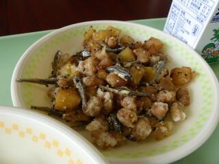 メニューは、麦ご飯、八宝菜、大豆と小魚の揚げ煮でした。