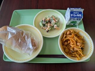 メニューは、ミニコッペパン、きのこのペンネ、ゴボウのかみかみサラダ、牛乳でした。