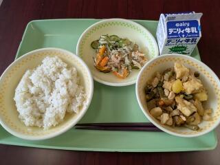 本日は、麦ご飯、麻婆豆腐、ほうれん草のゴマ和え、牛乳でした。
