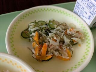 今日は、麦ご飯、春雨スープ、キャベツのそぼろ煮、牛乳でした。
