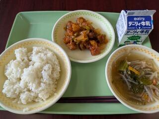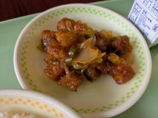 今日は、麦ご飯、野菜とフォーのスープ、酢豚、牛乳でした。