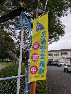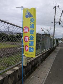 国富町のウズラ車がプリントされたのぼり旗が、みなさんの安全を願っています。