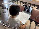 毎朝、各家庭と登校時の検温、換気を実施しながらの0エアコン使用、活動場面ごとの手指消毒など、新型コロナウイルス感染予防と熱中症対策を行いながらの学校生活です。始業式は各教室をオンラインでつないで、代表児童による作文発表もご覧のとおり行いました。