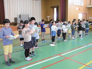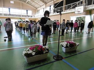 下校は、全校児童による集団下校でした。25日の卒業式は、在校生は参加しないことになっているため、1年生から6年生までそろう場はこれが最後となります。1~5年生から、卒業する6年生に向けて感謝の言葉を述べ、6年生からも言葉が返されました。この後、下校班に分かれて児童は帰っていきました。令和元年度修了の日が終わりました。次は卒業式です。