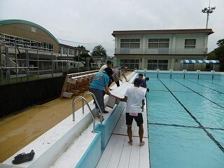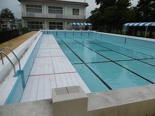 「命の教育」の一貫でもある「水遊び・水泳運動」が間もなく始まります。本校では、大プールのみでの授業ですので、低学年用には水深を浅くするためにアジャスターフロアを使用します。先日、職員作業を行いましたので、あとはプール開きを待つのみです。