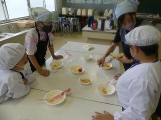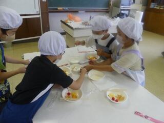 4年生は、家庭科室で缶詰のフルーツやアイスクリームを使ってパフェ作りをしていました。