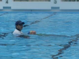 「顎を上に突き出すとお尻が沈むよ。」「小さなペットボトルは、顎の下に入れて。」と先生からコツを教えてもらいながら、浮く練習をしました。みんな、上手に浮くことができていました。