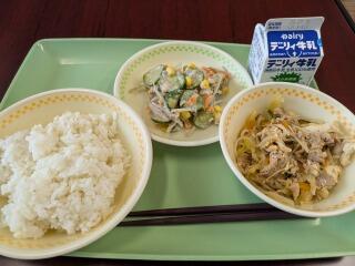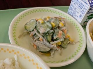 メニューは、麦ご飯、高野豆腐の卵とじ、胡瓜の土佐酢和え、牛乳でした。
