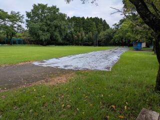 夏季休業に入り、グラウンドの草たちも勢いづいている頃ですが、夏休みに入るときに、グランウンドのトラックに防草のためのシートを敷きました。太陽光を遮り、さらに熱により草の生長をおさえるはたらきがあります。
