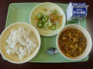 メニューは、麦ご飯、厚揚げのそぼろ煮、きゅうりとわかめの酢の物、牛乳でした。