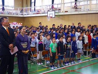 今年度は17名の新入児が森永小学校に入学してきました。新入児氏名点呼では、みんな元気いっぱいの大きな返事をしていました。在校生も新入児に負けじと児童委員会の子どもたちが学校生活や行事について紹介したり、2年生が振りをつけて「さんぽ」を歌ったりと、新入児の入学を全校児童でお祝いしました。