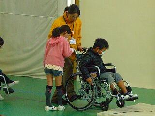 この体験は総合的な学習の時間の一環で、国富町の社会福祉協議会の方に来ていただき、車いすの体験やアイマスク体験をしました。