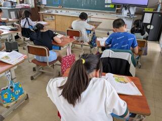 背筋を伸ばし、お腹と机の空間を少し空けて・・・みんな「立腰」ができているかな。