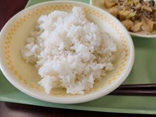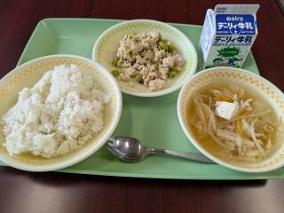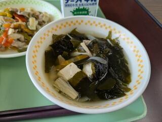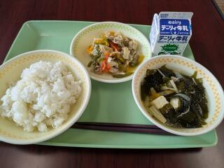 メニューは、麦ご飯、わかめスープ、青椒肉絲、牛乳でした。