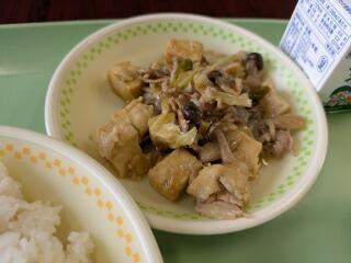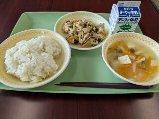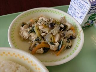 今日は、麦ご飯、なめこの味噌汁、鶏肉とキノコのうまから炒め、牛乳でした。