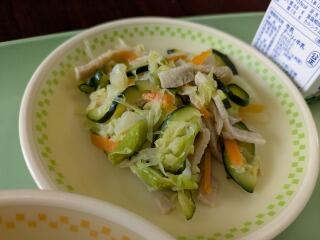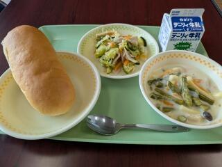 メニューは、コッペパン、アスパラのクリーム煮、ズッキーニのサラダ、牛乳でした。