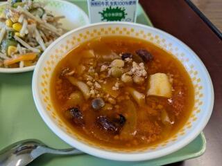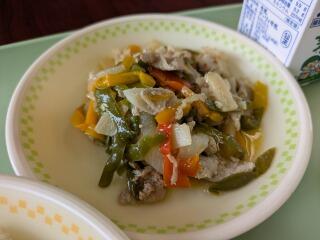メニューは、麦ご飯、野菜とフォーのスープ、ホイコーロー、牛乳でした。