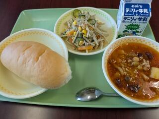 メニューは、コッペパン、チリコンカン、かみかみサラダ、牛乳でした。