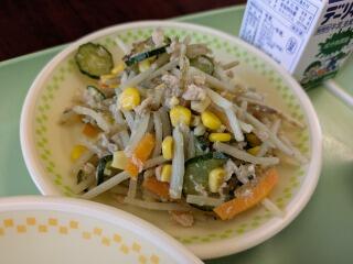 メニューは、麦ご飯、麻婆豆腐、中華サラダ、牛乳でした。