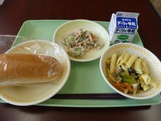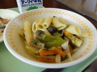 メニューは、ミニコッペパン、きのこのペンネ、ゴボウのかみかみサラダ、牛乳でした。