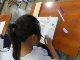 一人一人、品物が描かれたたくさんの絵カードから3枚だけ選び、封筒に入れ廊下につり下げていました。