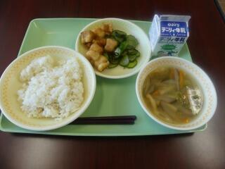 本日のメニューは、麦ご飯、のっぺい汁、鱈のゴマ揚げ煮、きゅうりの塩昆布和え、牛乳です。