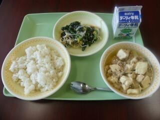 本日は、麦ご飯、麻婆豆腐、ほうれん草のゴマ和え、牛乳でした。