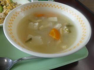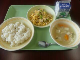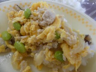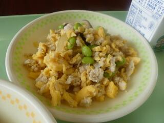 今日の三食は、豚肉の赤、枝豆の緑、卵の黄でした。彩りを考えた給食は、食欲も進みます。