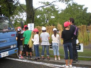 今日(10月7日〔月〕)、JA青年部の皆さんの御指導、御協力のもと、5年生が稲刈りを行いました。刈った稲は、学校のフェンスに干しました。JA青年部の皆さんありがとうございました。