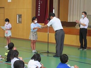 6月の全校朝会では、雨の日の登下校の安全について、担当の先生からお話がありました。続いて、6年の河村彩花さんと4年の友花さん姉妹が、自転車競技で好成績を修め表彰されました。
