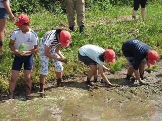 心配していた前日の雨も止み、日差しがまばゆい中、5年生は田植えを行いました。ほぼ全員が田植え初体験、JA青年部の皆様の指導の下、手際よく植えることができました。JAの皆さん、ありがとうございました。