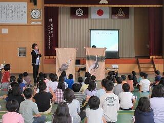 6月15日(木)に、出水市ツル博物館「クレインパークいずみ」から講師の先生をお招きし、ツルについて学びました。森永小は、出水市へ渡来してくるツルの餌として使ってもらうために、毎年、二番穂を刈って送っています。今回、その出水のツルについて、講演をしていただき、貴重な経験でした。子供達は実物大のツルの模型等にふれることもでき、喜んで学習しました。