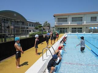 晴天に恵まれた6月19日(月)、プール開きを行いました。先生からのお話しを聞き、安全やルールを守ることなど気を引き締めた後、水しぶきを元気に浴びながら入水しました。