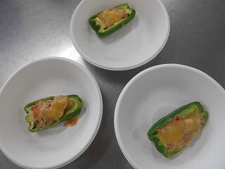 また、町の食生活改善推進員の方のサポートを受けて、「ピーマンのシーチキンチーズ焼き」を作りました。おいしくいただきました。