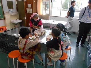 また、実際に給食も食べていただきました。その後、給食センターの栄養教諭から、給食ができるまでの様子を話していただきました。