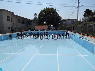 5月16日(火)にプール清掃を行いました。3・4校時に5年生、5・6校時に6年生が一生懸命掃除をしました。1年間休んでいたプールがとてもきれいになりました。