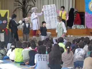 その後、給食委員会の児童が給食を大切に食べたり、片付けをしっかりしたりできるよう、全校児童に寸劇で呼びかけました。
