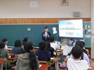 また、国富町では、5年生を対象に「DQWorld」というアプリを使って、情報モラル教育を進めています。11月16日(木)は、講師の青山さんをお迎えして、ICT機器のメリットや気をつける点について教えていただきました。