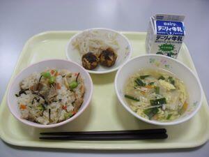 今日の献立は【中華おこわ・にらたまスープ・揚げシュウマイ・添えもやし】でした。今回は給食時間の放送内容を紹介します。『今日の中華おこわには、普通のお米と、モチモチした「もちごめ」を合わせて使っています。その「もちごめ」は、杢道地区の森山さんから綾小学校にプレゼントしていただきました。いつも勉強に運動にがんばっている児童のみなさんのために、食べさせてくださいとのことです。感謝していただきましょう。』でした。それでは、本日の綾町食材の生産者の方々を紹介します。米が有機米でアヤオーガニックワークスさん、もち米が杢道地区の森山さん、にんじんが久木野地区の郡さん、長ネギが杢道地区の爰野さん、ほうれん草が割付地区の福重さん、きゅうりが四枝地区の清水さんでした。今日も美味しい食材・美味しい調理ありがとうございました。