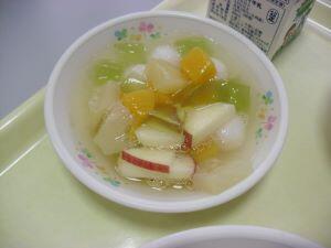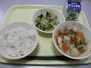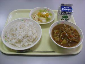 今日の献立は【根菜カレー・フルーツ白玉】でした。根菜カレーには、玉ねぎ・にんじん・ごぼう・れんこん・大根・じゃがいもの入ったとても美味しいカレーでした。フルーツ白玉もとても美味しく、後味がすっきりでした。それでは、本日の綾町食材の生産者の方々を紹介します。米が有機米でアヤオーガニックワークスさん、にんじんが久木野地区の郡さん、大根が四枝地区の山口農園さん、じゃがいもが揚町地区の西郷さんでした。今日も美味しい食材・美味しい調理ありがとうございました。