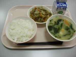 今日の献立は【麦ご飯・千切り大根の味噌汁・豚と綾野菜の生姜焼き】でした。今回は給食時間の放送内容を紹介します。『今日は、明日が16日で「ひむか地産地消の日」なので、綾町でとれた野菜や肉をできるだけ使って、味噌汁と炒め物にしました。綾町でとれた有機米、小松菜、にんじん、キャベツ、千切り大根、エリンギなど綾愛いっぱいの食材と、宮崎県産の食材いっぱいの給食です。おいしくいただきましょう。』でした。それでは本日の綾町食材の生産者の方々を紹介します。米が有機米でアヤオーガニックワークスさん、にんじんが杢道地区の爰野さん、小松菜が割付地区の福重さん、キャベツが揚町地区の西郷さん、エリンギが古屋地区の宮崎産業さん、千切り大根が中堂地区のほとくり会の皆さんでした。今日も美味しい食材・美味しい調理ありがとうございました。