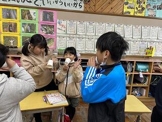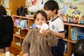 糸電話を使った学習が楽しかったようで、準備時間にも実験を楽しんでいました。