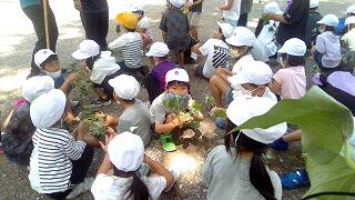 学校の畑に、サツマイモの苗を植えました。