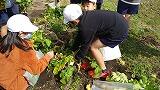 まずは、長く伸びたいものつるを引っ張って、うねの片側に寄せました。つぎに、いものつるの根元が見えたら、かまで切り落とします。(これは地域の方にしていただきました。)そして、うねにかかったマルチをはがします。