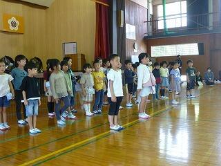 1年生から6年生まで全員そろった全校体育。待つことが多くて大変だったけど、1年生もよく頑張りました!