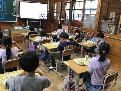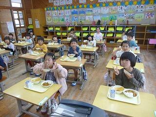 初めての給食はカレーライスでした。みんなおいしそうに食べていました。