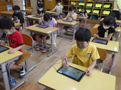 入学して約2ヶ月たち、1年生も学校生活に慣れてきました。そこで、タブレット学習を始めることにしました。電源の入れ方から、タッチの練習、終了の仕方を教えてもらい、とても楽しそうでした。