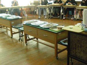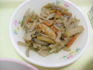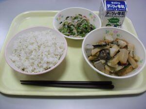 今日の献立は【麦ご飯・わかめスープ・チャプチェ】でした。今回は給食時間の放送内容を紹介します。『今日は、韓国料理の献立です。どちらにもごま油を使っています。ごま油は、炒ったごまから油を取り出しています。香りがいいので、スープにも香りづけに使っています。とり過ぎなければ、体にいい油です。味わっていただきましょう。』でした。それでは本日の綾町食材の生産者の方々を紹介します。米が有機米でアヤオーガニックワークスさん、えのきたけが古屋地区の宮崎産業さん、にんじんが久木野地区の郡さん、長ネギが杢道地区の爰野さんでした。今日も美味しい食材・美味しい調理ありがとうございました。
