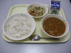 今日の献立は【食パン・マーシャルビーンズ・チリコンカン・りんごサラダ】でした。チリコンカンは、大豆たっぷりでトマトソースの味が肉や具材に染みとみ、とても美味しかったです。りんごサラダも、りんごの食感がサクサクして酸味と甘さがあり、さわやかでとても美味しかったです。それでは本日の綾町食材の生産者の方々を紹介します。にんじんが久木野地区の郡さん、しめじが古屋地区の宮崎産業さん、キャベツが揚町地区の西郷さん、きゅうりが四枝地区の清水さんでした。今日も美味しい食材・美味しい調理ありがとうございました。